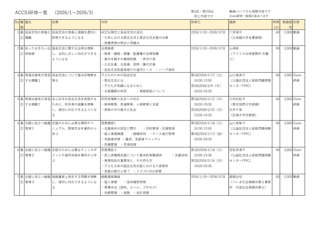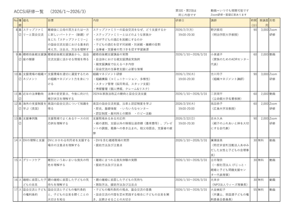 ACCSJ研修プログラムリスト【2026年1月〜3月】のPDFはこちら(下記画像のリストと同じものです)